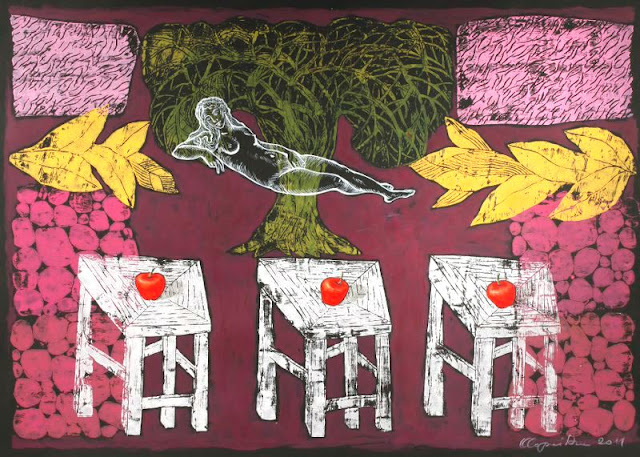 "Jedno jabłko Parysa" 2011, rysunek + technika mieszana na papierze, 50cm x 70cm